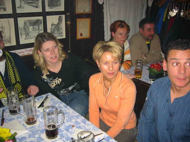 Mit Einbruch der Dunkelheit machte sich ein Großteil der Reisegruppe auf den Weg zur „Dürer-Stube“, romantisch gelegen im Schatten der Kaiserburg jenseits der Pegnitz. Die Atmosphäre war familiär, das Essen überwiegend wie gemalt und das „Dürer-Dunkel“ gut gekühlt und äußerst lecker. Dass gegen Ende der Vorstellung Rainer u.a. mit dem „Lochgefängnis“ wegen Zechprellerei gedroht wurde, konnte die Stimmung kaum beeinflussen, zumal sich am folgenden Tag die Prellerei als „leichter“ Rechenfehler, der schon mal passieren könne, entpuppte. Der Absacker bei ErnstL dauerte unterschiedlich lang, die Salsa-Fraktion legte sich ebenfalls erst später aufs Ohr. Glücklicherweise fanden Ranchid und Benita auch den Weg ins Hotel.