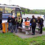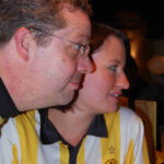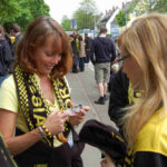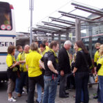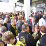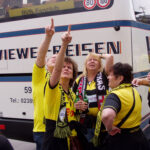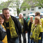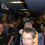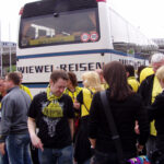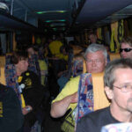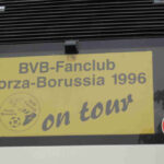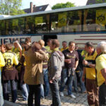 Kurz nach halb sechs, Freitagmorgen, nass-kaltes Nieselwetter, einstellige Temperatur, aber in der Poststraße in Bönen rührte sich was. Ein Reisebus taucht aus dem grau auf und viele schwarz-gelbe Menschen wuselten aus Autos um den Bus und begrüßten sich freundlich und drückten dem tristen Morgen ihren eigenen Stempel auf – es ist Fanclub-Tour -.