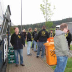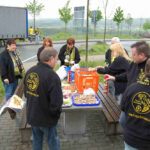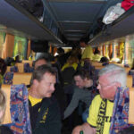 Viele fleißige Hände griffen beherzt zu um den Reiseproviant zu verstauen und 30 Kisten Brinkhoff´s No. 1 verschwanden in Null-Komma-Nichts im Bus. Darin hatte man ja Übung, war ja nicht die erste Fanclub-Tour. Der Bus wurde geschmückt mit vielen BvB-Plakaten und Fahnen und alle verteilten sich im Bus und pünktlich um 6 Uhr ging’s auf die Bahn.