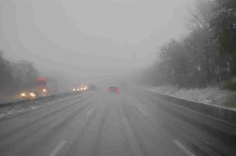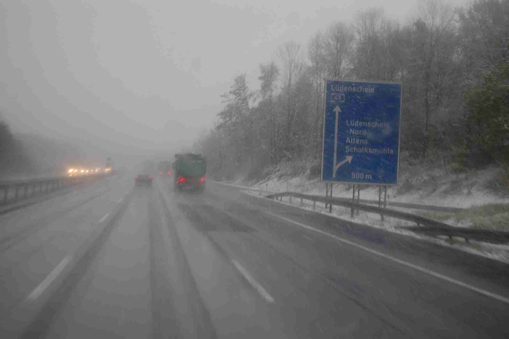 Klaus, unser Busfahrer, bekräftigte nach einem netten Guten-Morgen-Gruß, dass er als Nicht-BvB-Fan und Nicht-Fußball-Fan alles tun werde, so nette Fans sicher und zügig nach Freiburg zu fahren. Unser Präsi schloss sich dem Guten-Morgen-Gruß an, erklärte kurz den Ablauf und gab den Getränkeverkauf frei. Auf der A45, Höhe Lüdenscheid rieben sich Einige verwundert die Augen und dachten sie hätten schon zu tief in zu viele Brinkhoff´s No. 1 Flaschen geschaut, aber es war Realität – Schnee … soweit das Auge schaute, es war alles weiß. Unbeeindruckt davon schmeckte das Bier und auch diverse kleine Flaschen mit diversen bunten Etiketten machten die Runde. Man(n) und auch Frau musste sich ja schützen vor dem plötzlichen Wintereinbruch. Gemurmelte Worte wie „Hätte ich mal Socken mitgenommen o. ¾ Hosen sind nicht so ganz schneetauglich, “ wurden ignoriert.