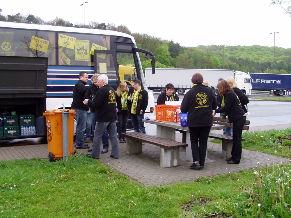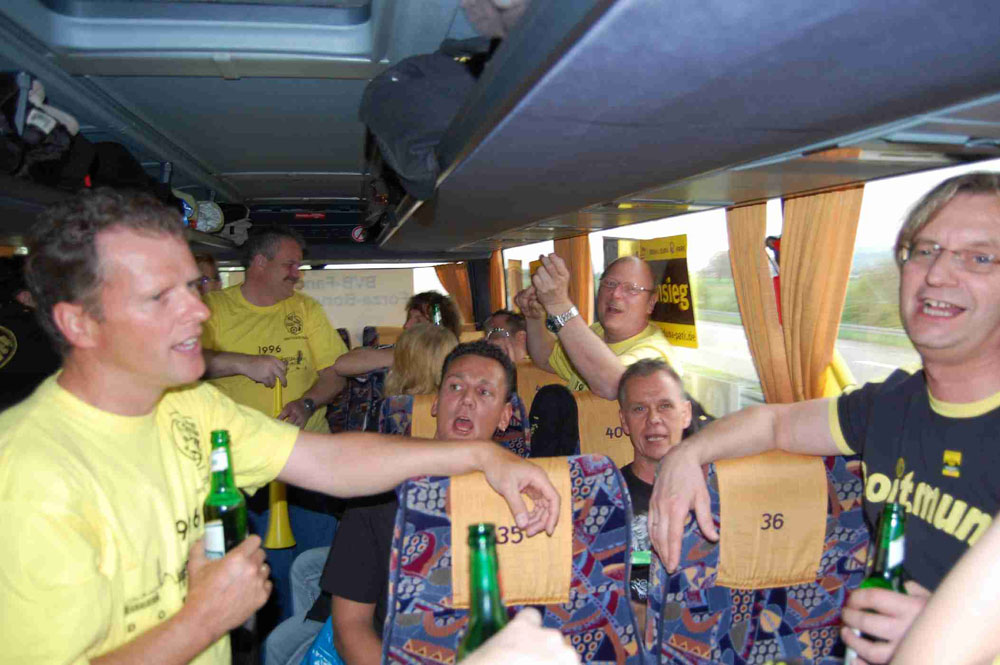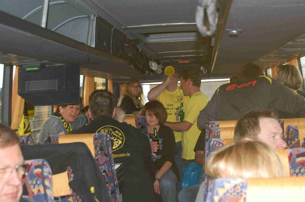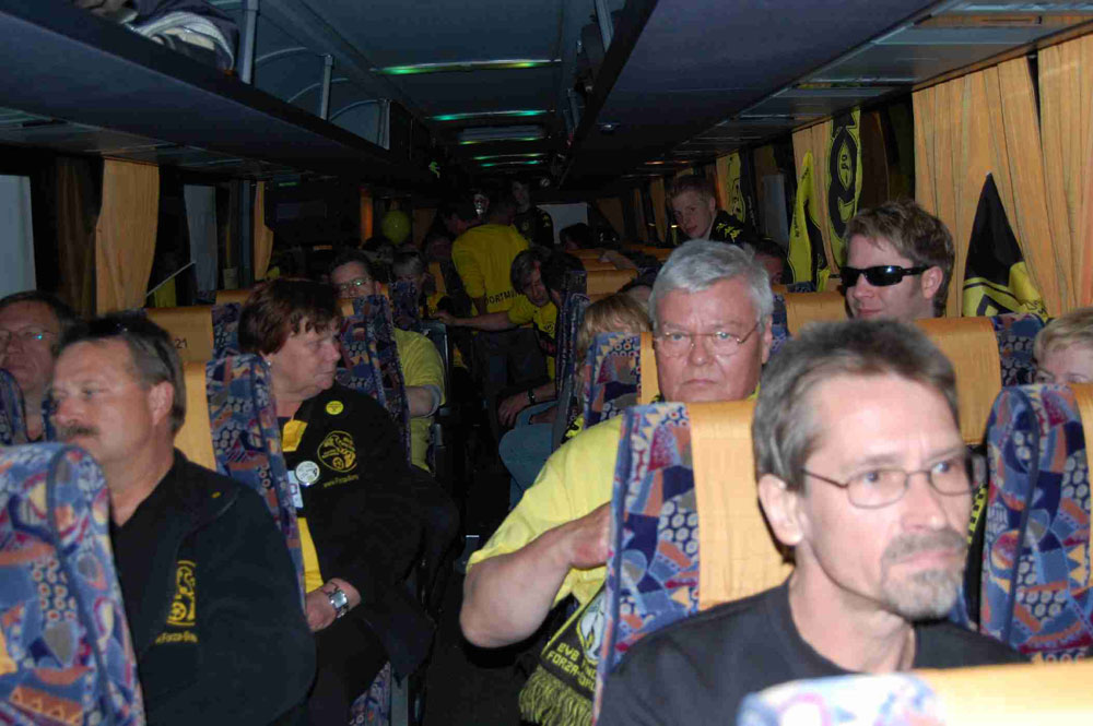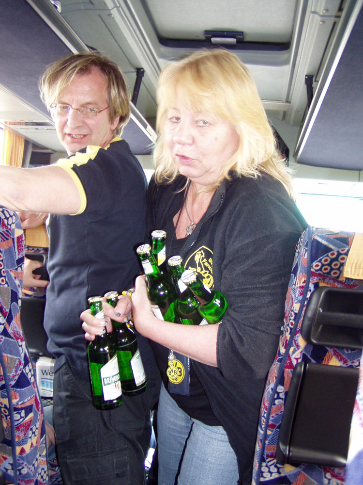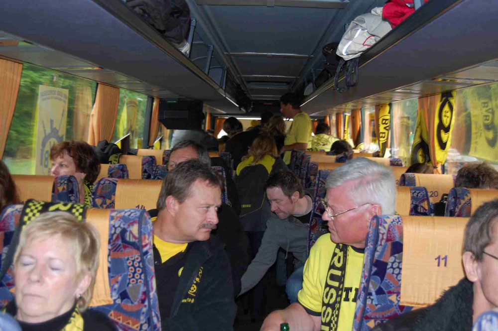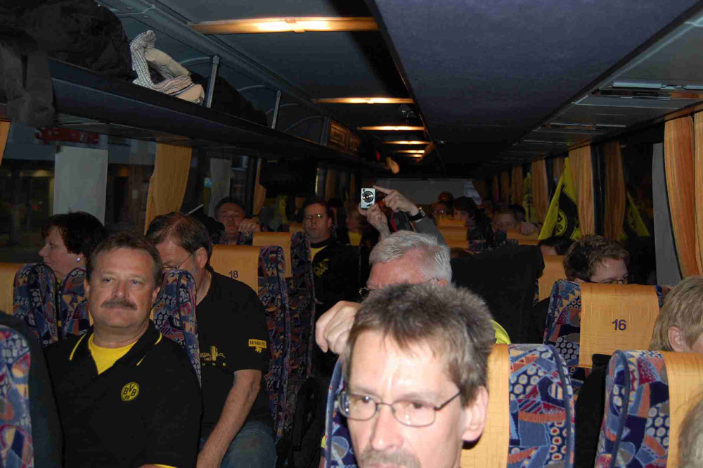 Viele fleißige Hände griffen beherzt zu um den Reiseproviant zu verstauen und 30 Kisten Brinkhoff´s No. 1 verschwanden in Null-Komma-Nichts im Bus. Darin hatte man ja Übung, war ja nicht die erste Fanclub-Tour. Der Bus wurde geschmückt mit vielen BvB-Plakaten und Fahnen und alle verteilten sich im Bus und pünktlich um 6 Uhr ging’s auf die Bahn.