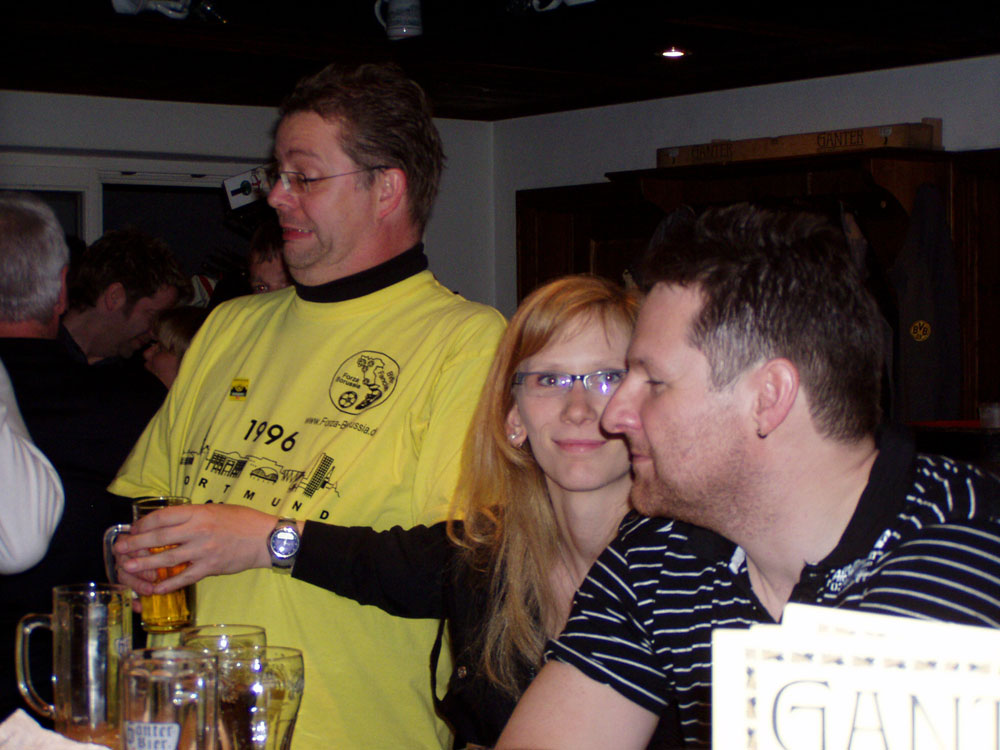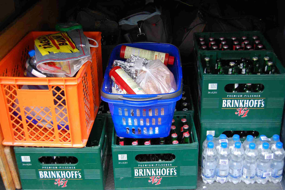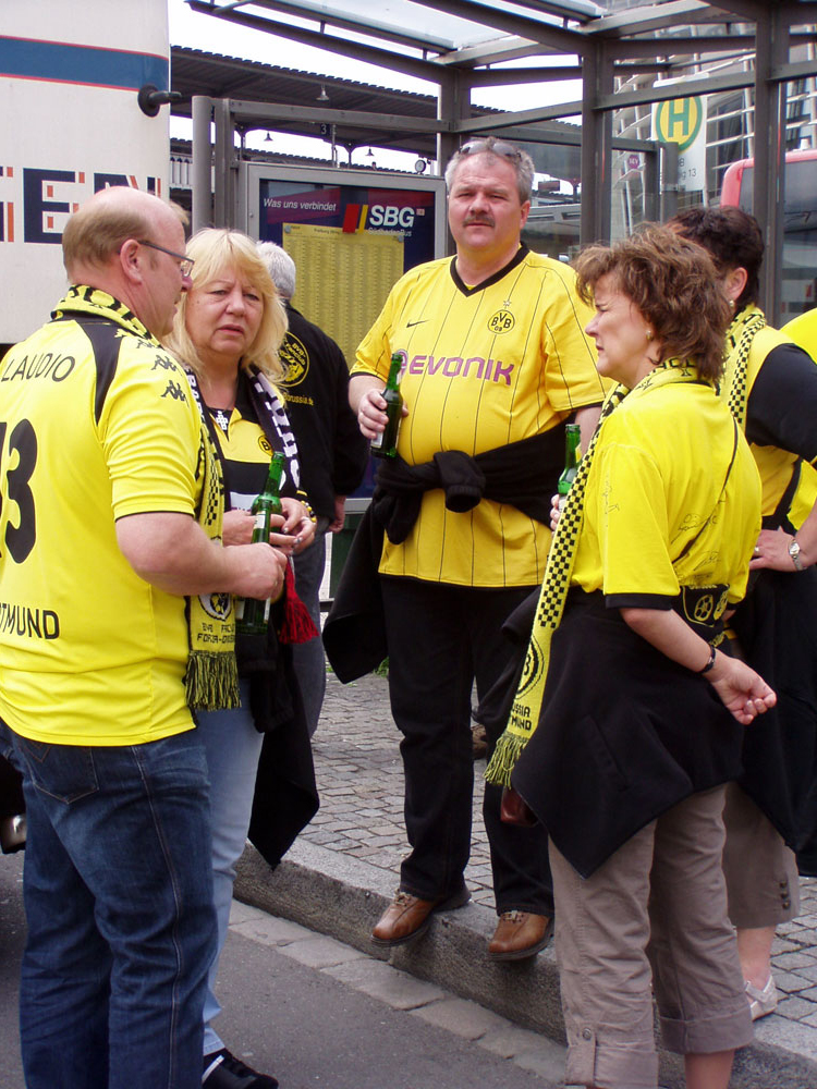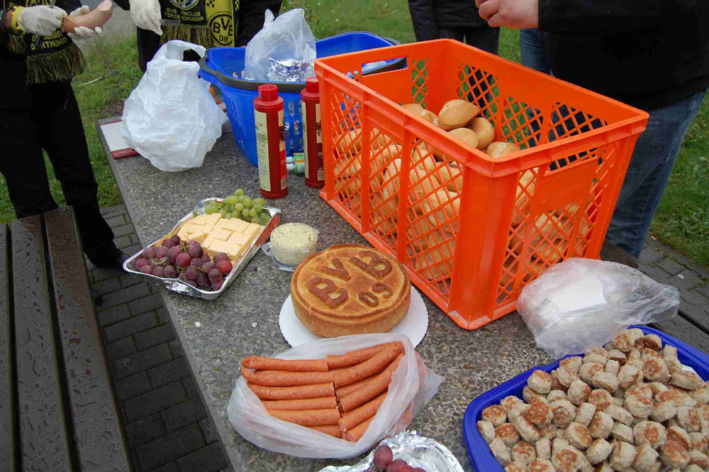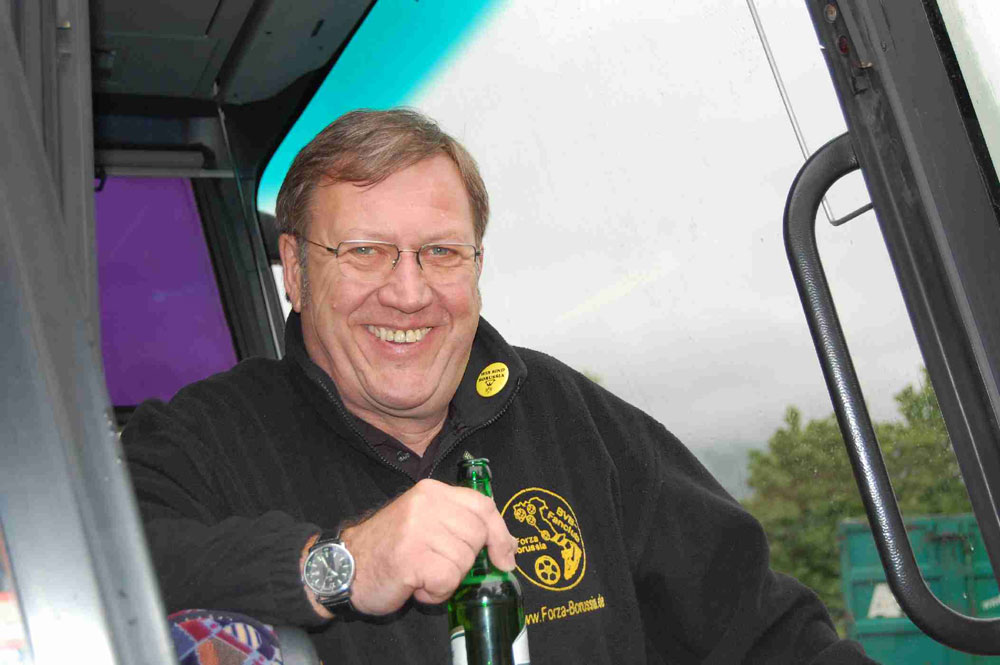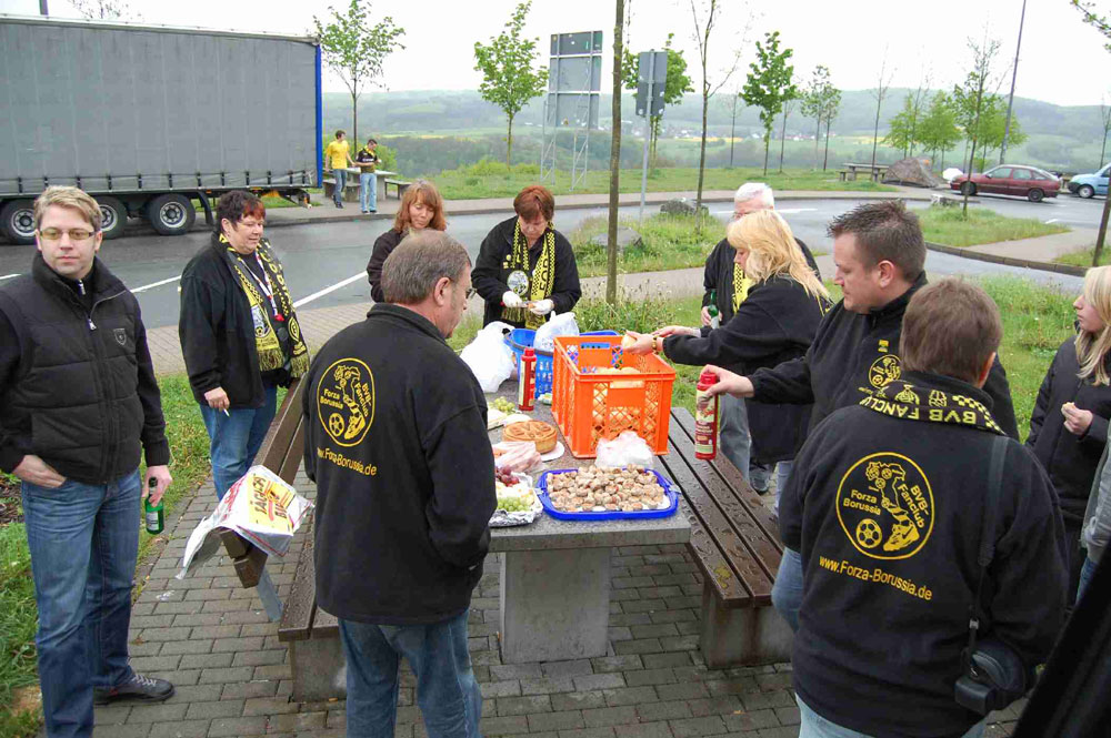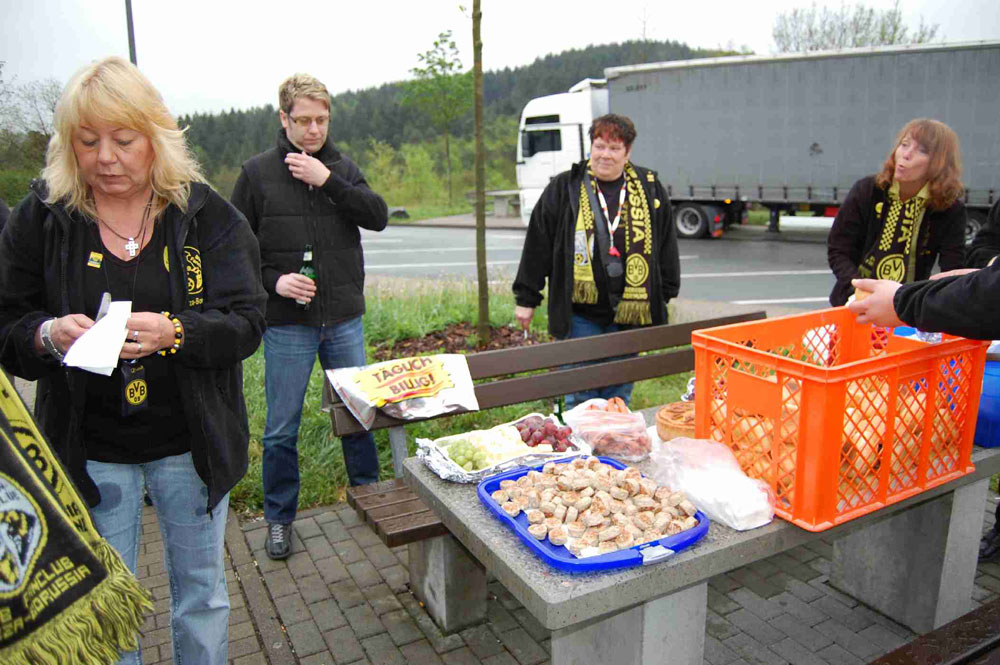 Viele fleißige Hände griffen beherzt zu um den Reiseproviant zu verstauen und 30 Kisten Brinkhoff´s No. 1 verschwanden in Null-Komma-Nichts im Bus. Darin hatte man ja Übung, war ja nicht die erste Fanclub-Tour. Der Bus wurde geschmückt mit vielen BvB-Plakaten und Fahnen und alle verteilten sich im Bus und pünktlich um 6 Uhr ging’s auf die Bahn.