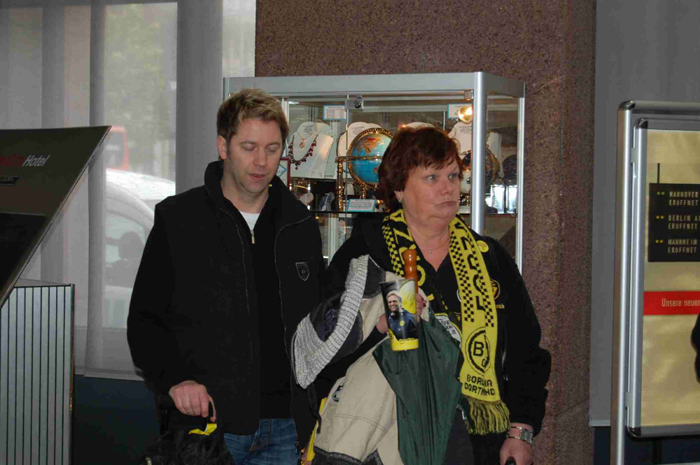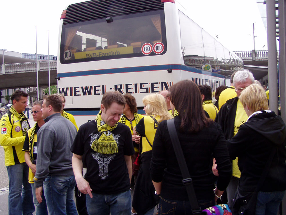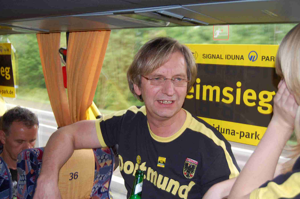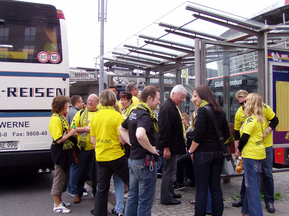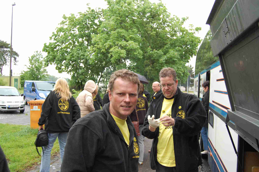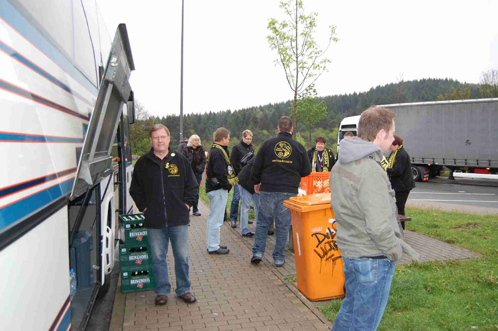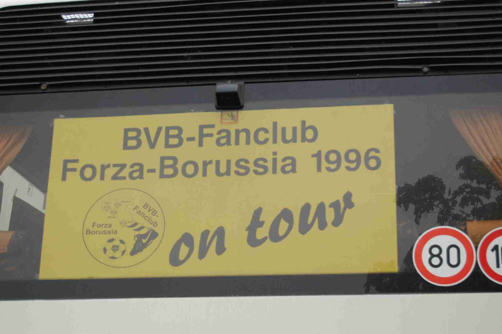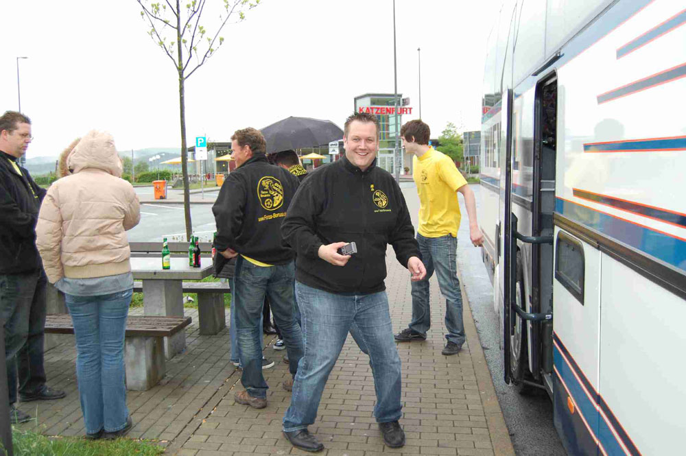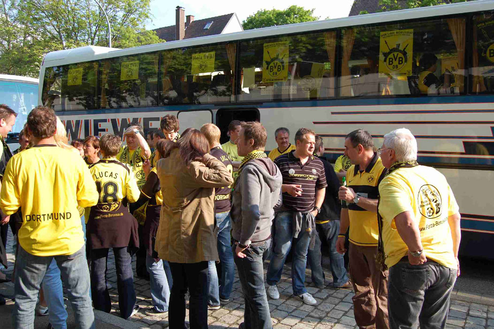 Kurz nach halb sechs, Freitagmorgen, nass-kaltes Nieselwetter, einstellige Temperatur, aber in der Poststraße in Bönen rührte sich was. Ein Reisebus taucht aus dem grau auf und viele schwarz-gelbe Menschen wuselten aus Autos um den Bus und begrüßten sich freundlich und drückten dem tristen Morgen ihren eigenen Stempel auf – es ist Fanclub-Tour -.