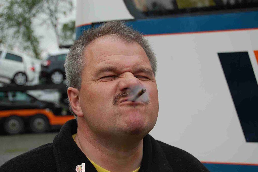 So rollten wir um 8 Uhr auf die Raststätte Katzenfurt, zwecks Pippi-, Rauch- und Frühstückspause. Wie immer mit frischen Brötchen, Fleischwurst, Mettwurst und Frikadellen, dazu hatte Elke ein zünftiges BvB-Brot gebacken und natürlich frisches gekühltes Brinkhoff´s No 1. Hier lag kein Schnee mehr, der Regen machte Pause und die Temperatur war noch immer einstellig.