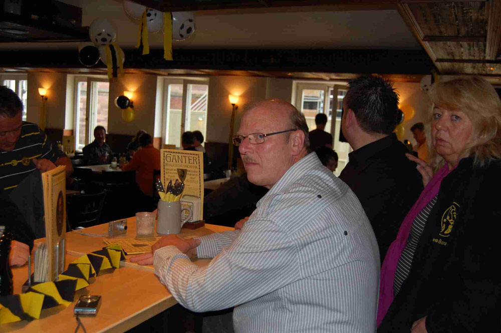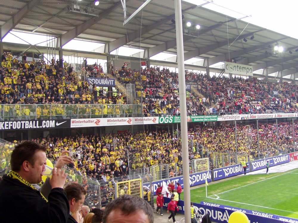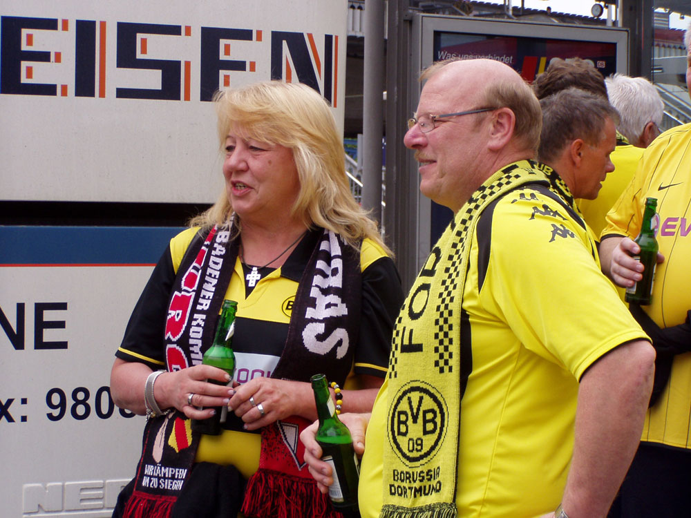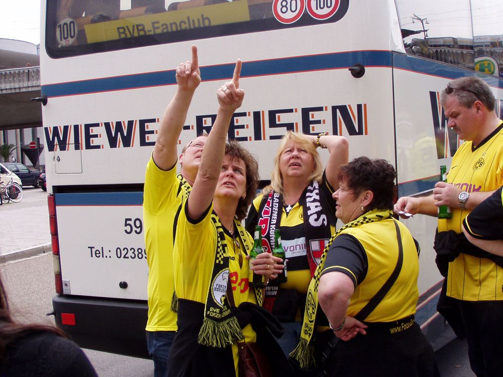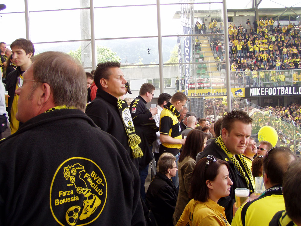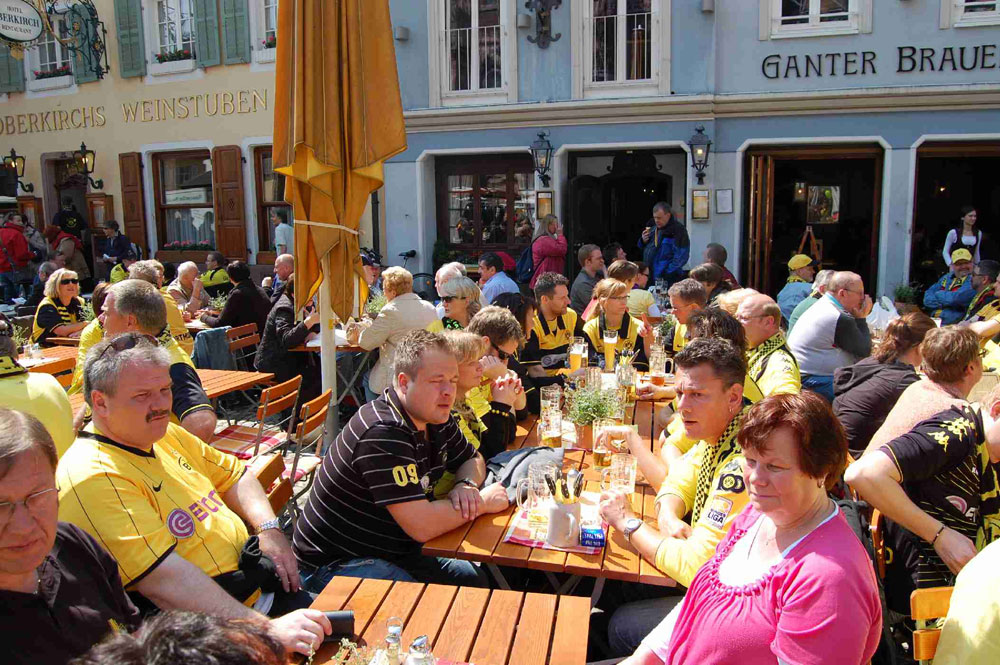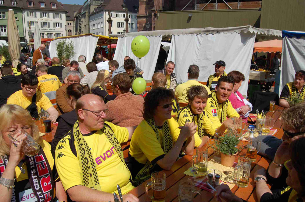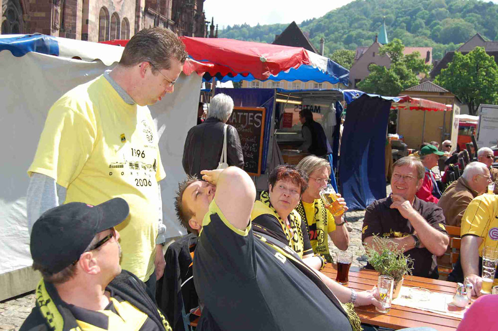 Frühstücksbuffet war von 7 – 11 Uhr und bis dahin haben es auch fast alle (siehe Markus und der Sekt) geschafft sich für das Spiel zu stärken. Wieder wurde Freiburg erobert, wobei die Farben der Stadt eindeutig schwarz-gelb wurden. Auschecken, Restproviant einladen, einsteigen und ab ging’s um 14 Uhr zum Freiburger Badenova-Stadion. Mit über 8000 schwarz-gelben Fans und großer Vorfreude erreichte uns plötzlich die erste Hiobsbotschaft des Tages „Hansi hat seine Eintrittskarte verloren“. Deprimiert hatte er sich schon in den Bus zurückgezogen, aber durch den unermüdlichen Einsatz unseres Präsi und des 2. Vorsitzenden des SC Freiburg konnte ihm eine Ersatzkarte besorgt werden. Diese Karte kostete Hansi nur eine Runde „alkoholfreie“ Getränke im Bus. Die einhellige Meinung aller „Forzesen“ war, dass diese Investition sich für Hansi nicht gelohnt hat, wir haben verloren (3:1), zweite Hiobsbotschaft.