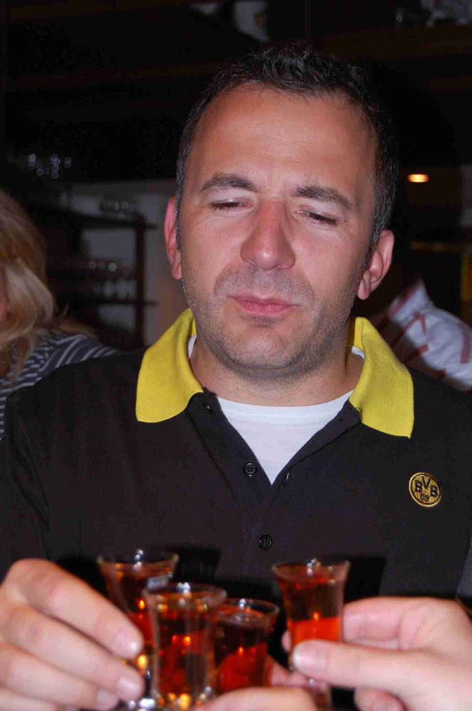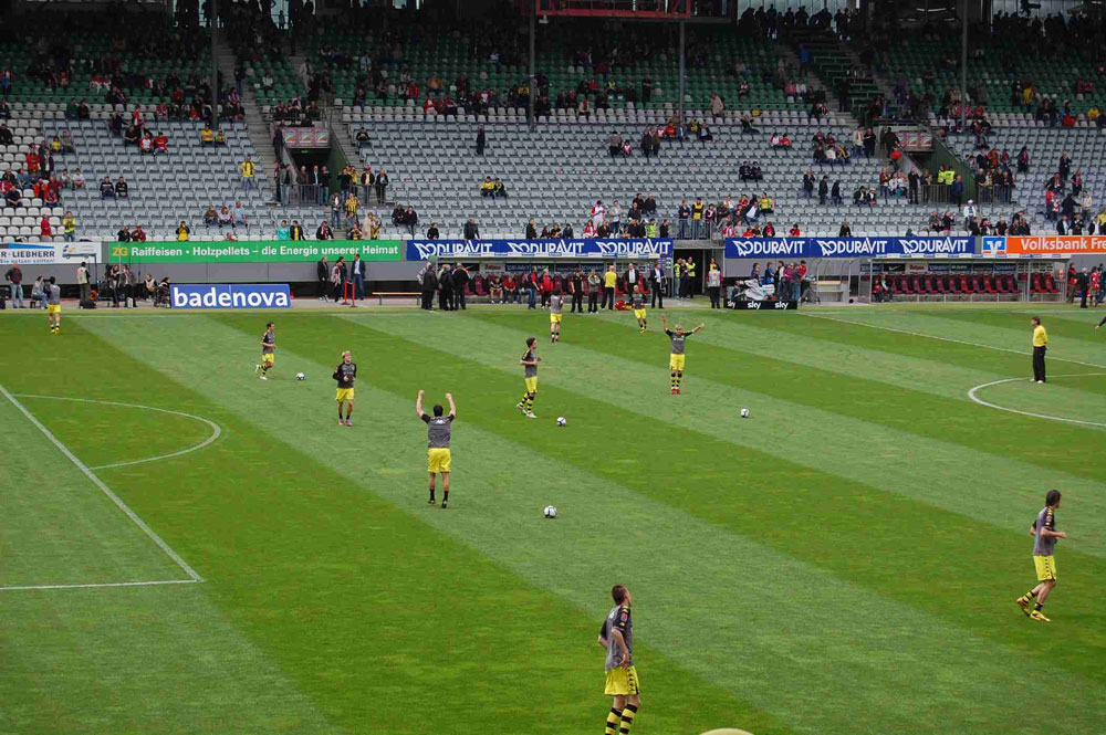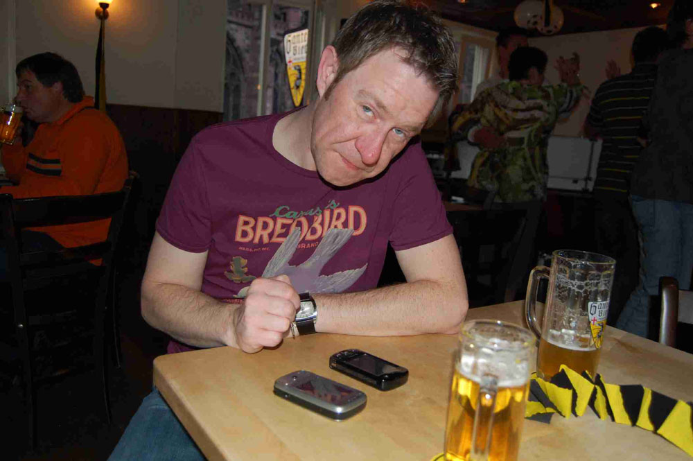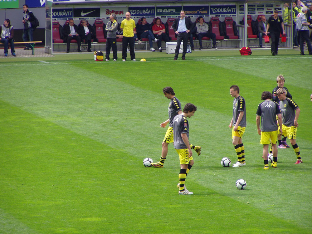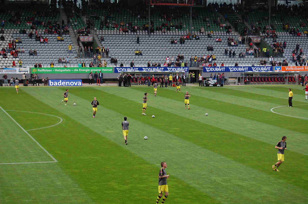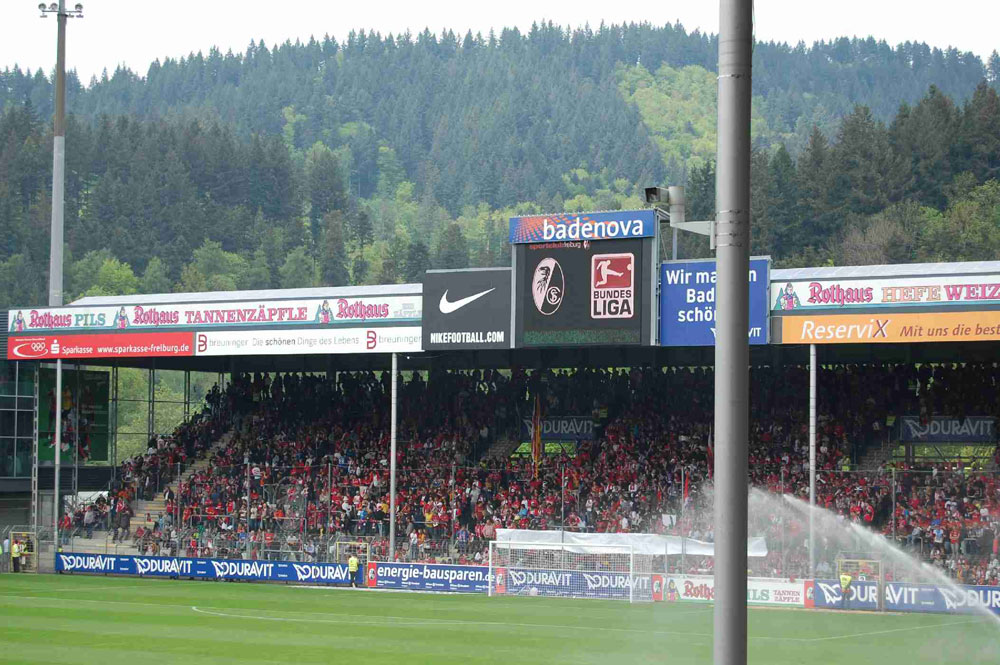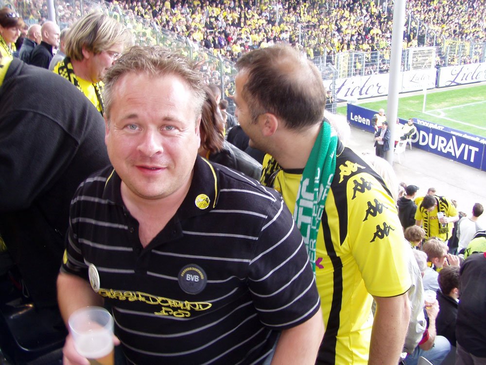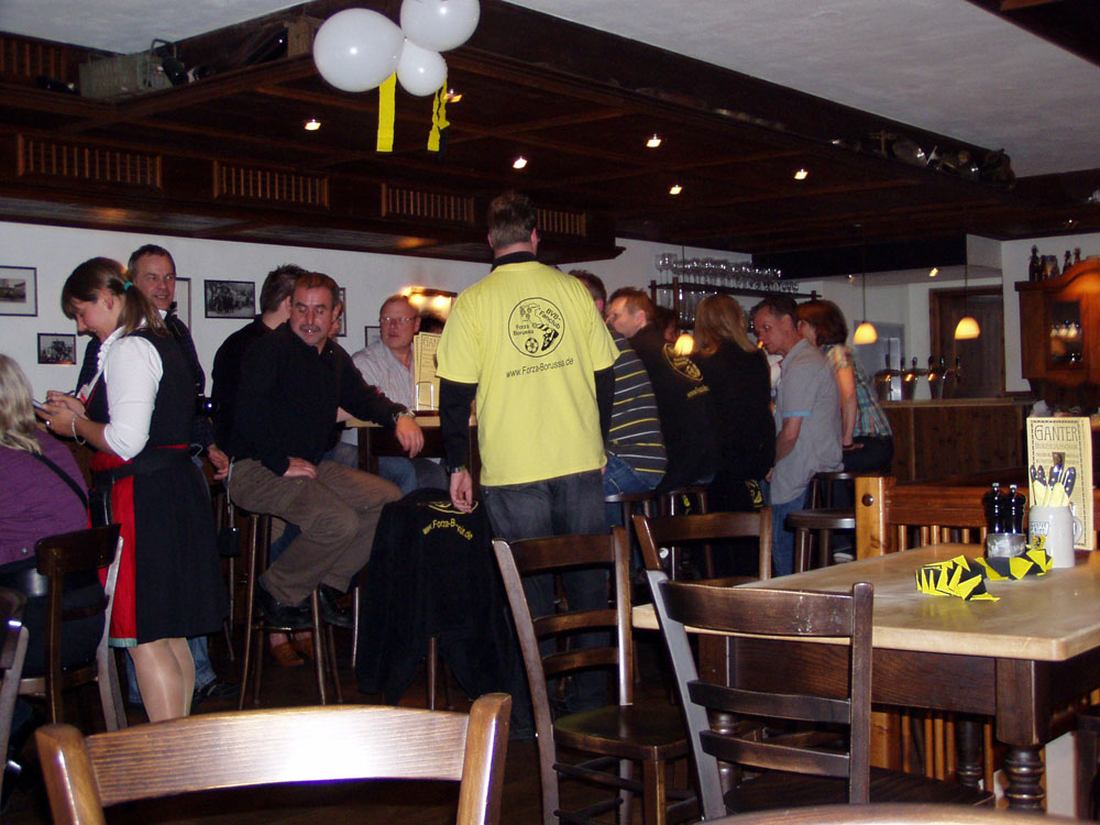 Frühstücksbuffet war von 7 – 11 Uhr und bis dahin haben es auch fast alle (siehe Markus und der Sekt) geschafft sich für das Spiel zu stärken. Wieder wurde Freiburg erobert, wobei die Farben der Stadt eindeutig schwarz-gelb wurden. Auschecken, Restproviant einladen, einsteigen und ab ging’s um 14 Uhr zum Freiburger Badenova-Stadion. Mit über 8000 schwarz-gelben Fans und großer Vorfreude erreichte uns plötzlich die erste Hiobsbotschaft des Tages „Hansi hat seine Eintrittskarte verloren“. Deprimiert hatte er sich schon in den Bus zurückgezogen, aber durch den unermüdlichen Einsatz unseres Präsi und des 2. Vorsitzenden des SC Freiburg konnte ihm eine Ersatzkarte besorgt werden. Diese Karte kostete Hansi nur eine Runde „alkoholfreie“ Getränke im Bus. Die einhellige Meinung aller „Forzesen“ war, dass diese Investition sich für Hansi nicht gelohnt hat, wir haben verloren (3:1), zweite Hiobsbotschaft.