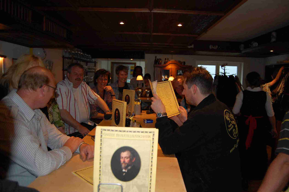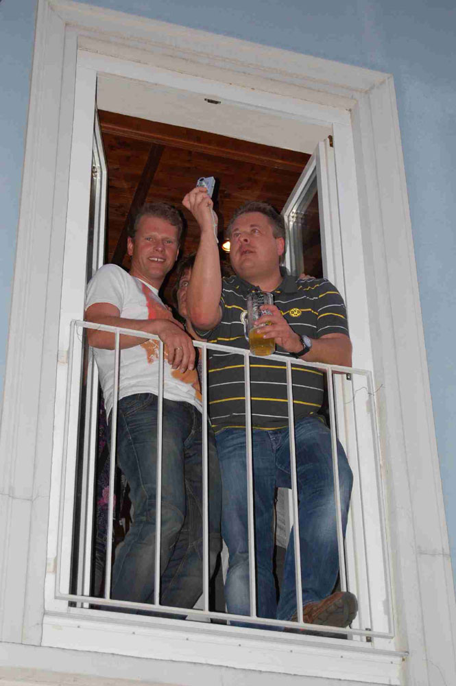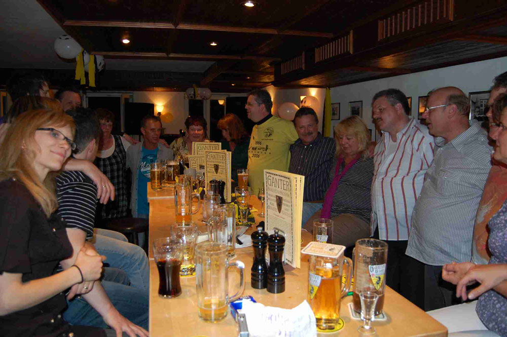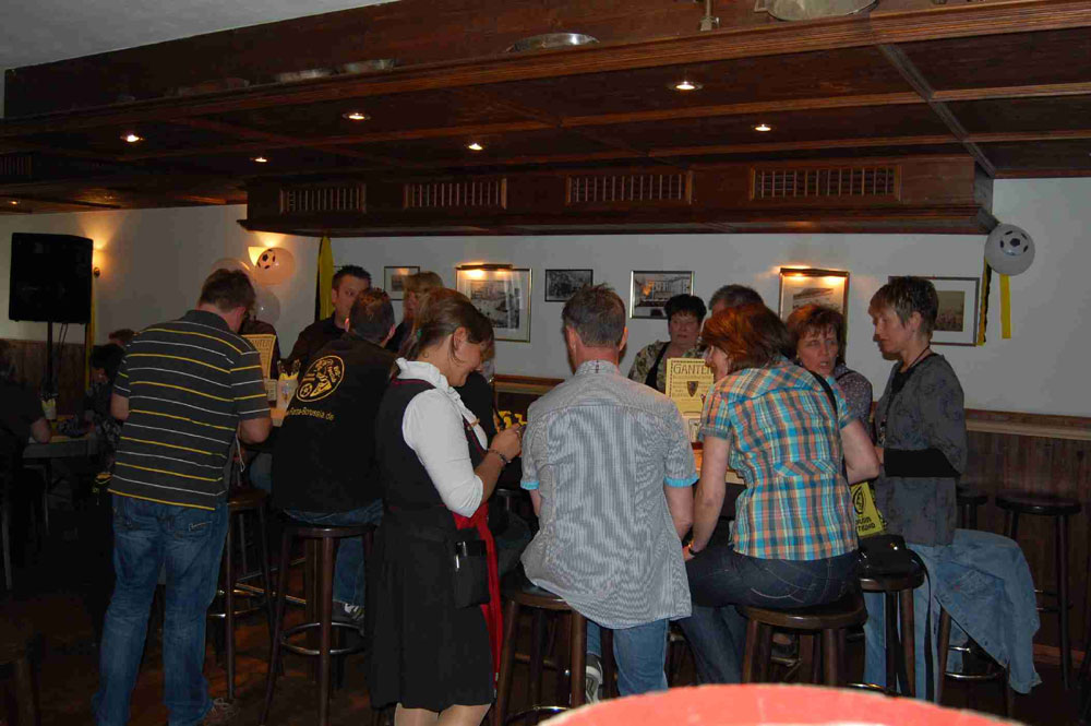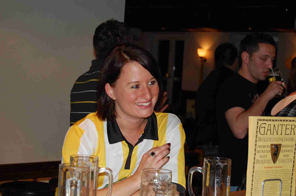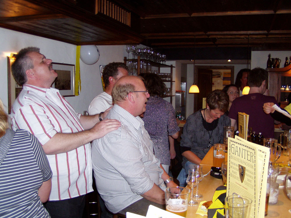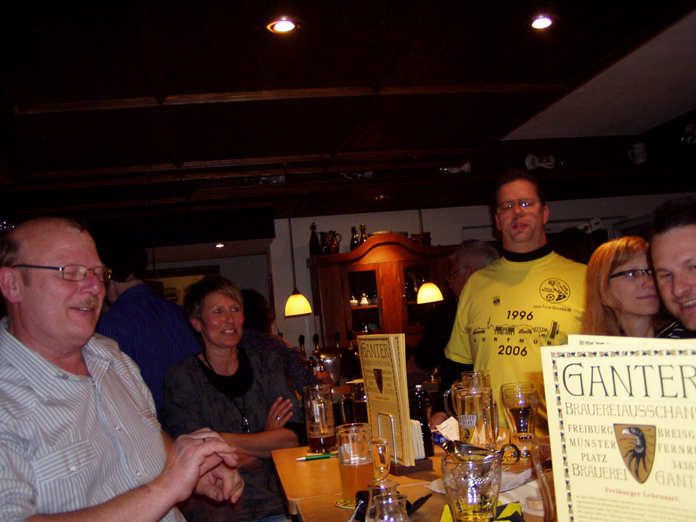 Um 19 Uhr trafen sich (fast) alle zur Fan-Club-Party im Brauereiausschank Ganter direkt am Freiburger Münster. Neben „lecker“ Bier und dem Buffet mit einheimischen Schmankerln servierte „DJ Markus“ die passende Musik. Die Stimmung war gut, die Luft warm und alle Fenster offen, was den Teilnehmern eines Kammerkonzertes im Münster nicht so recht passte, da ihre und unsere Musik nicht wirklich miteinander harmonisierte. Also Fenster zu und Musik wieder lauter, denn wer Schnee im Mai abkann kommt mit tropische Hitze erst recht klar.