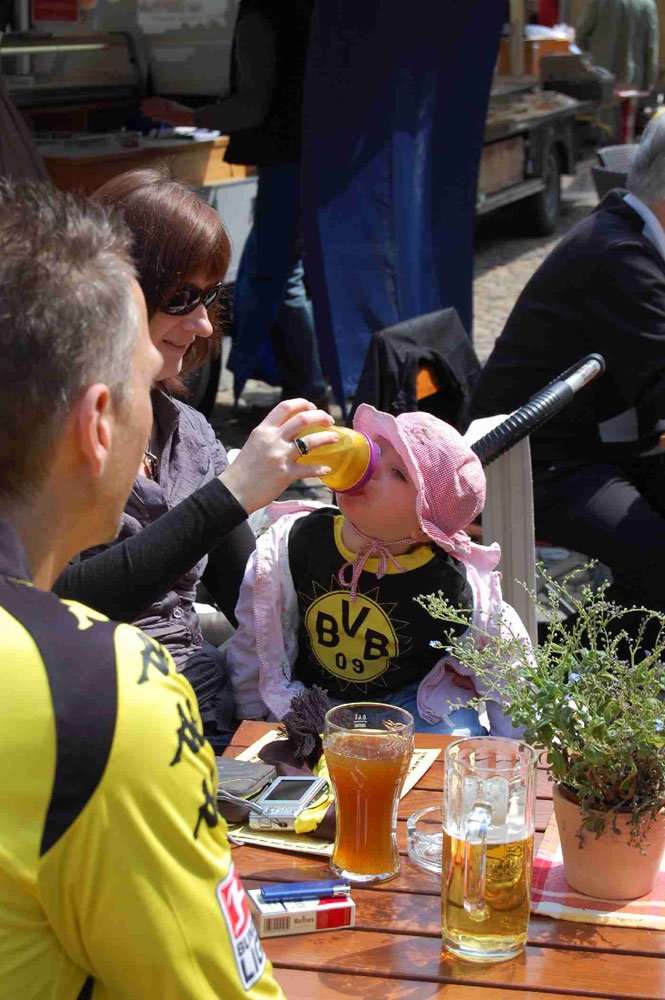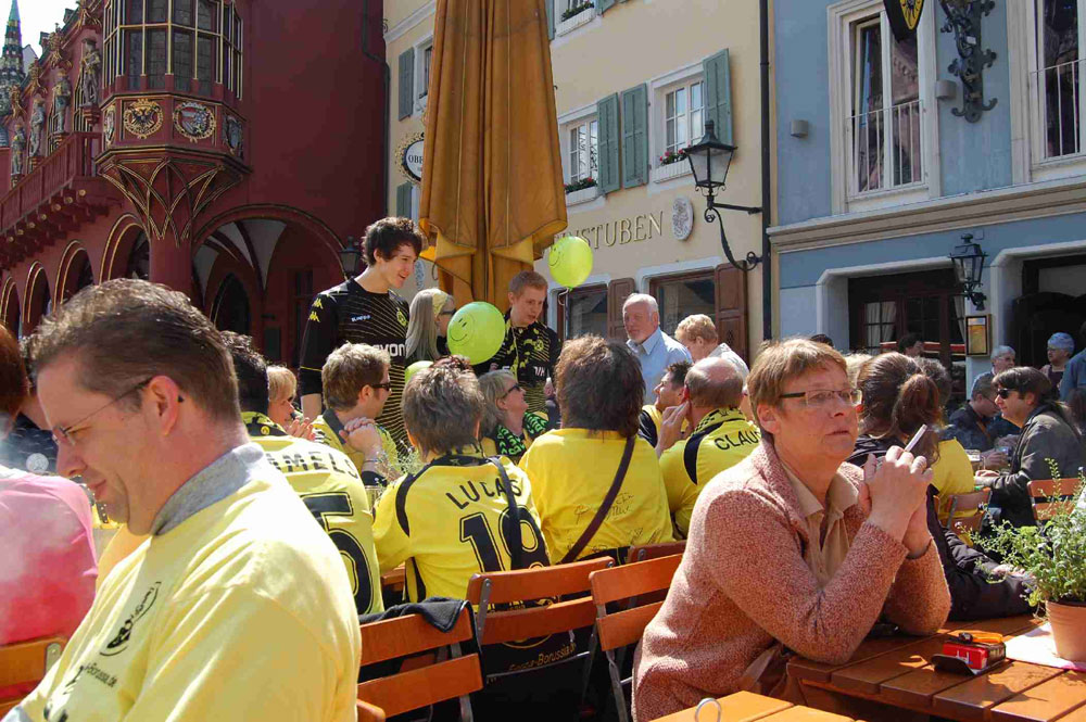 Freiburg, die Stadt in der wir uns die nächsten Stunden aufhalten werden wurde schwarz-gelb eingenommen mittels Stadtgang oder auch Bierverköstigung (DURST). Freiburg kann auf durchschnittlich 1800 Sonnenstunden im Jahr zurückblicken und hat uns mit blauem Himmel fast 20 ° und außerordentlich netten Menschen prima aufgenommen.