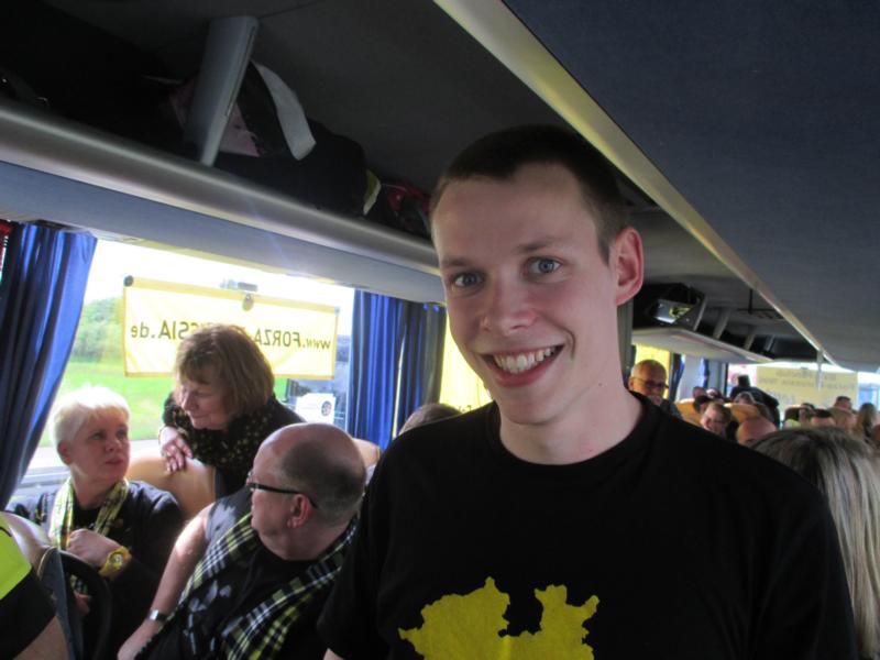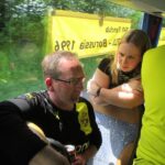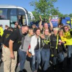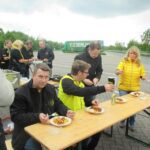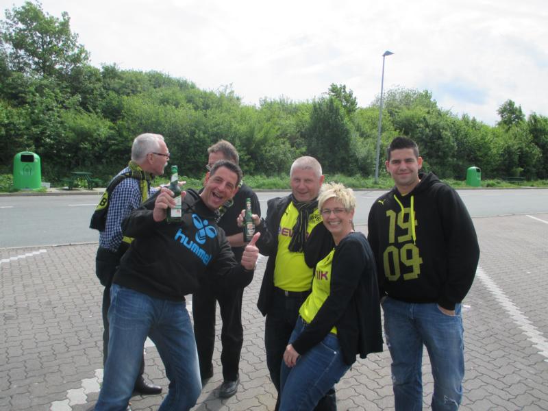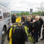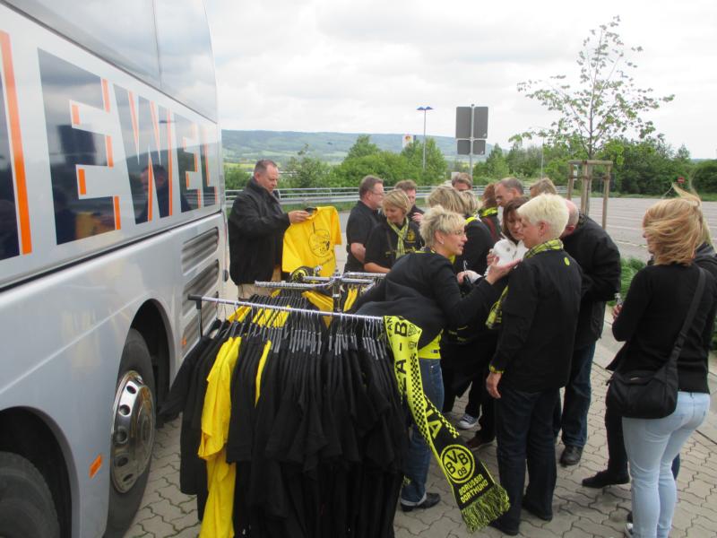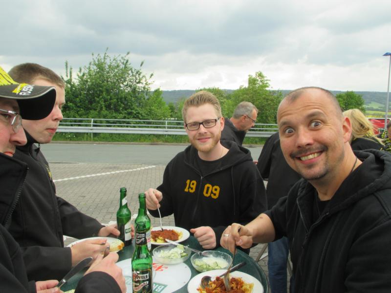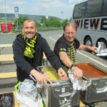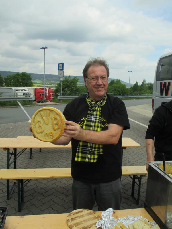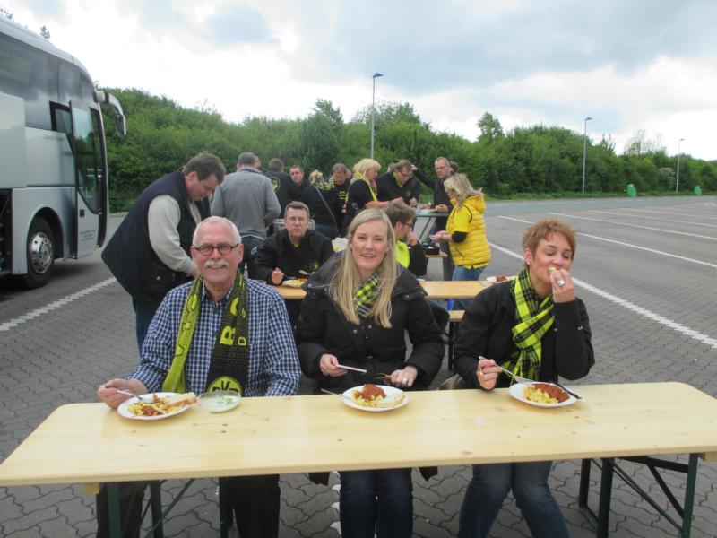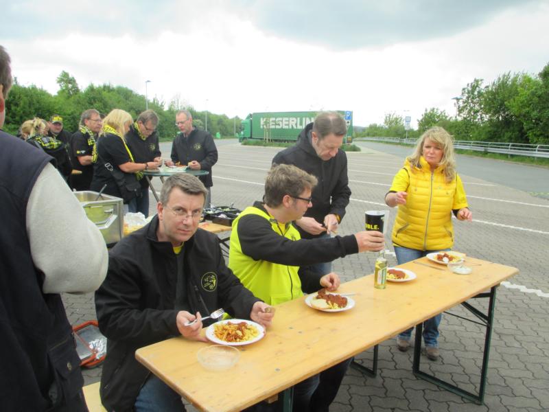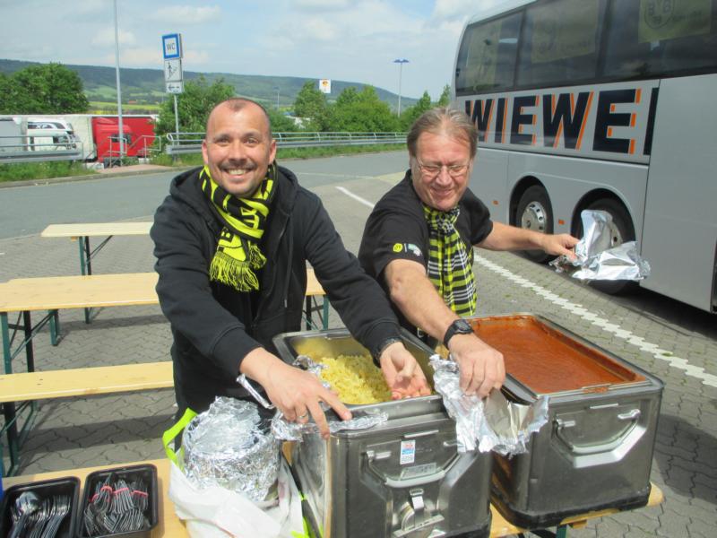 Traditionell spendiert der Fanclub allen Mitreisenden ein Fanclubfrühstück! Nicht so auf der ersten Auswärtstour über zwei Tage nach Berlin – eigens für den mittäglichen Stop wurde eine „Gulaschkanone“ aufgebaut. Gulasch und Nudeln sowie Gurkensalat und BVB-Brot mit echter BVB-Butter wurde von der Fangemeinde gerne angenommen. Neben dem Mittagstisch nutzen die Mitglieder und Freunde des Fanclubs den eigens auf der Raststätte aufgebauten Forza-Borussia-Fanshop für den Einkauf der schwarz-gelben Fanclubdevotionalien. Im Anschluss an den kulinarischen Mittagsstop ging es weiter auf die Autobahn A2 in Richtung Hauptstadt.